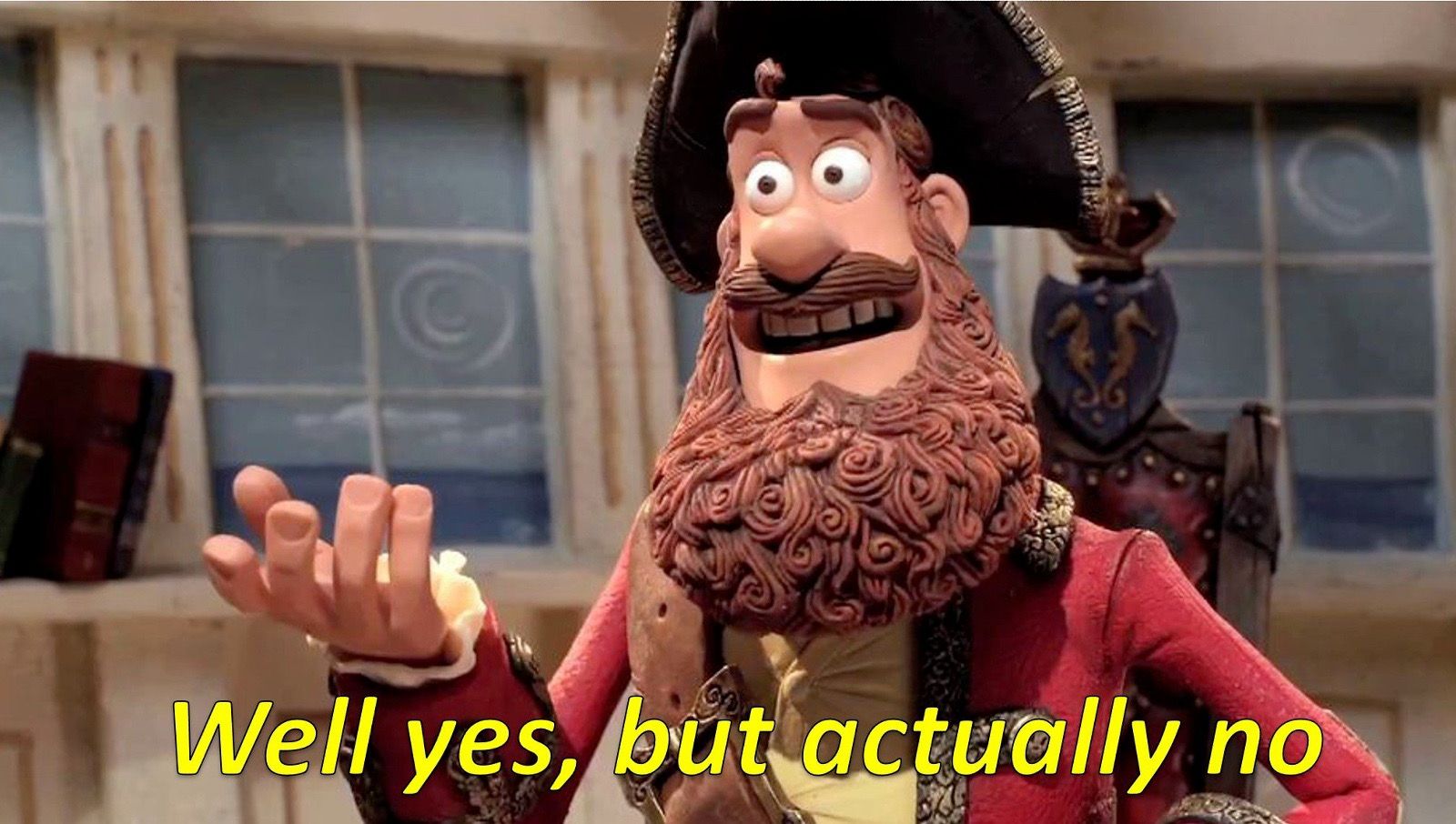 A scene from the Aardman claymation film where the Pirate Captain says "Well yes, but actually no" became the perfect response for technically-correct-but-wrong situations. The format exploded in early 2019 for describing contradictions and paradoxes.